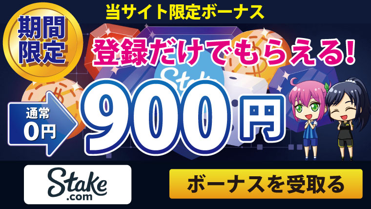 上のボタンを押して、当サイト経由でステークカジノに登録すると、賭け条件なしで$7(800円相当)のボーナスビットコインをプレゼント♪