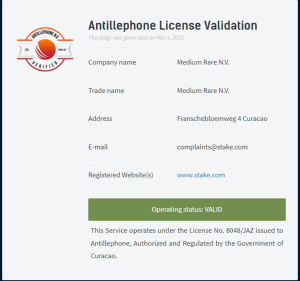 運営会社のMedium Rare N.V.は、登録番号及び住所が確認できました。会社は間違いなく存在しています。また、住所があるキュラソーはカジノが合法です。