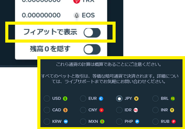 なお、後ほど解説しますが、仮想通貨のままの表示だと、残高やベット額の計算が面倒でわかりにくいのですが、ステークカジノ(Stake)では仮想通貨を法定通貨に換算して表示できるので便利です。