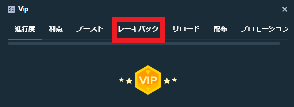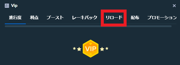 VIP関連のボーナスには、「リロード」「レーキバック」「レベルアップボーナス」「ウィークリーブースト」「月次ボーナス」があるので、1つずつ紹介します。