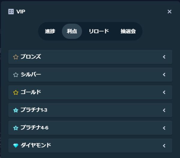 VIPレベルはブロンズ~ダイヤモンドまで10ランクもあり、最下位ランクのブロンズでもVIP特典がもらえます。