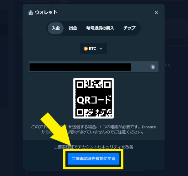 アカウント情報の入力が終わると、入金手続きができますが、入金画面に「2段階認証を有効にする」というボタンが表示されます。