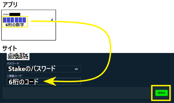 ステークカジノのパスワードと、アプリに表示されている「Stake/ユーザー名」の2段階認証コード(6桁の数字)を入力します。