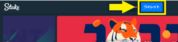 ステークカジノにログインをしたら、トップページ上部にある「ウォレット」を押します。
