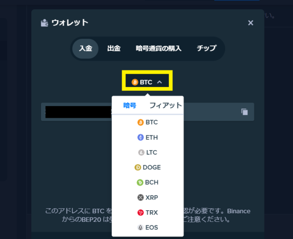 入金画面を開くと、「暗号通貨の購入」と表示されます。