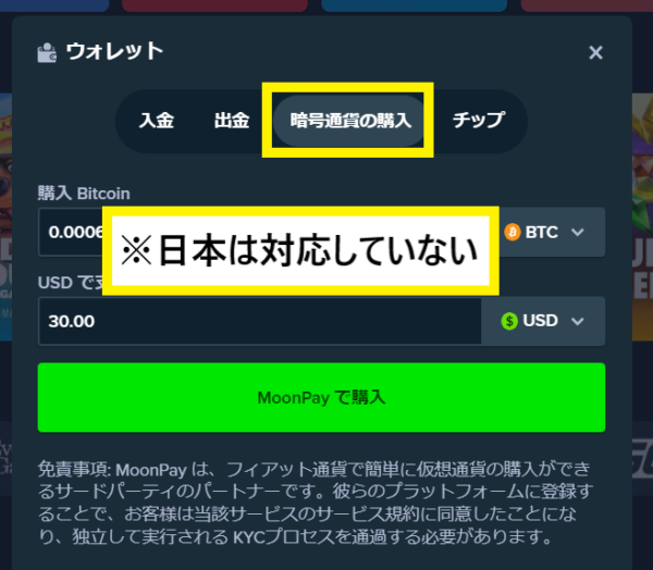 ステークカジノでは、Moon Payを経由して暗号通貨を購入できますが、残念ながら日本では未対応です。