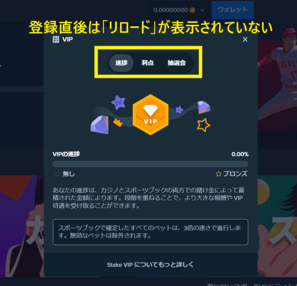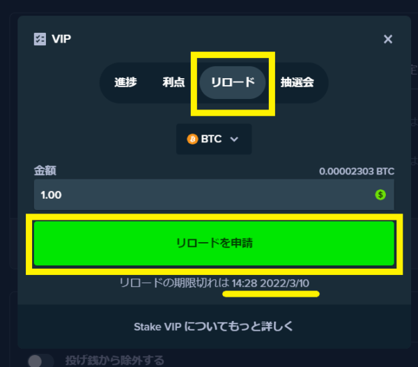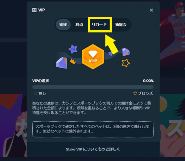 審査の間は入金不要ボーナスの申請手続きができませんが、審査にクリアしたら「VIP」を押すと「リロード」の文字が表示されて、ボーナスの申請ができるようになります。