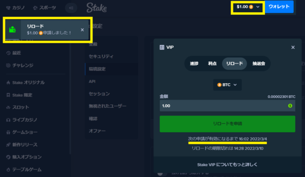 リロードボーナスは、24時間ごとに付与されます。そのため、24時間経ったら再び同じ手順で申請が必要です。