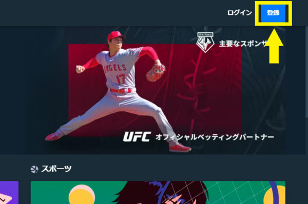 ステークカジノのサイトを開いたら、トップページ右上にある「登録」を押します。