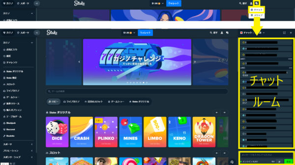 ステークカジノにはチャットルームがあり、ユーザー間でチャットをすることが可能。チャットは日本語OKです。