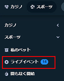 ライブベットできる試合を探す場合は、メニューから【ライブイベント】をクリックします。