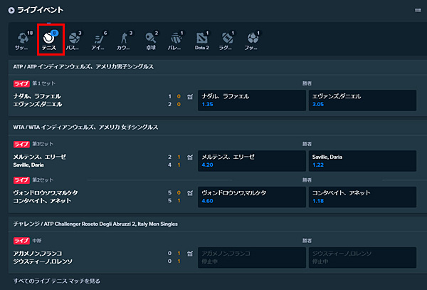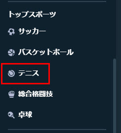 ライブイベントの一覧が表示されたら、赤枠の【テニス】をクリックします。