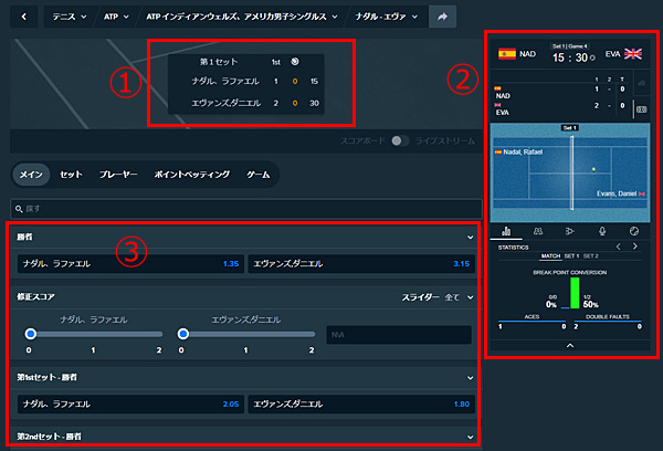 ステークカジノのテニスでは、勝敗以外にも様々なオッズ(賭け方)があります。