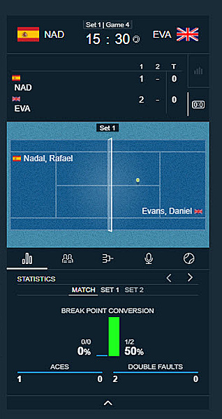 サービスエース、ダブルフォルトの本数、ブレークポイントの成功率などがリアルタイムで更新されてます。