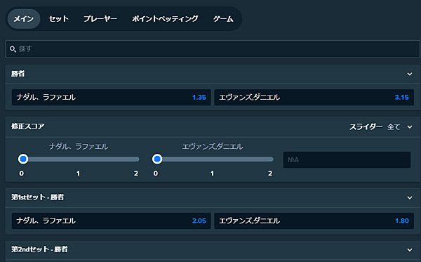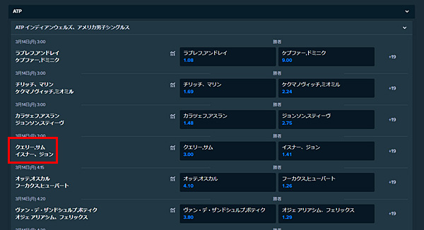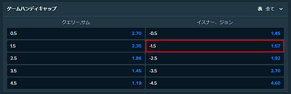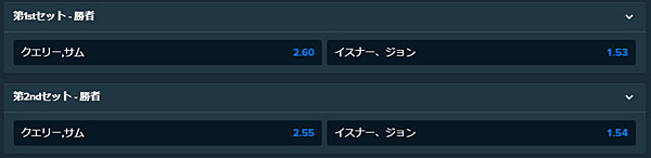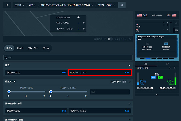 ジョン・イスナー選手の方がオッズが低いので、こちらを選んでみましょう。選手名の横にある数字がオッズです。