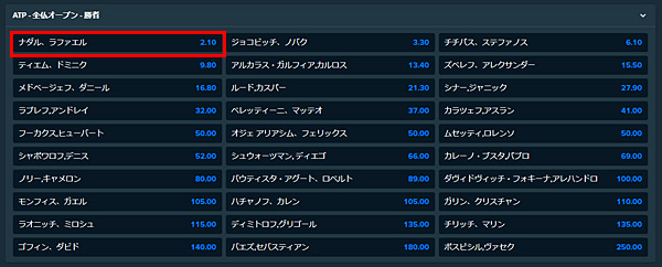 過去13回の優勝を達成し、クレーコートの最高勝率を保持するナダル選手のオッズが2.10でトップ、続いてジョコビッチ選手が3.30、チチパス選手が6.10となっています。