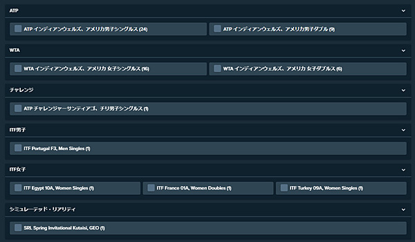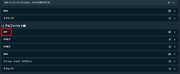 テニスの試合は、各カテゴリーごとに分けられています。ここでは、男子の【ATP】を選んでみます。