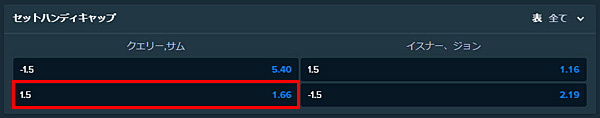赤枠のサム・クエリー選手の1.5に賭けた場合、1セット取ると獲得セット数が2.5になるので的中となります。