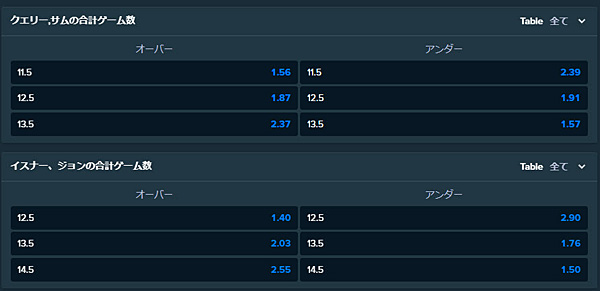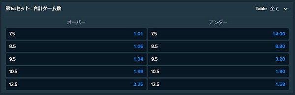各セットの合計ゲーム数が、基準よりも上か下かを予想する賭け方です。