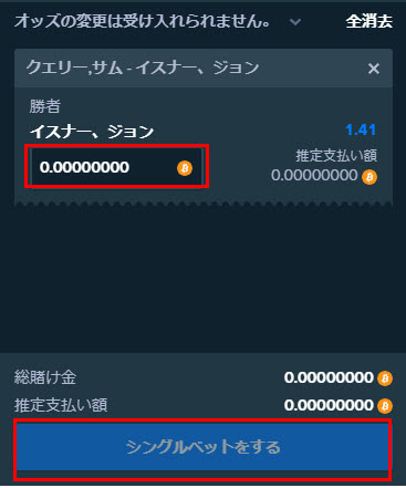 画面右のベットスリップ(賭け金の入力画面)が開くので、赤枠へ賭け金を入力し【シングルベットをする】をクリックすると、事前ベットが完了です。