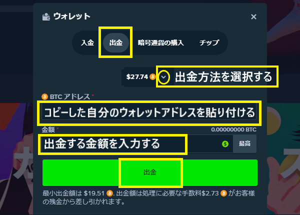 ステークカジノの出金方法は、