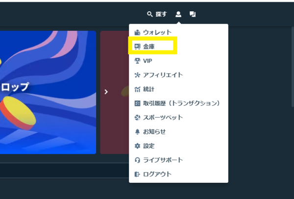 ログインをしたら、トップページ上部にあるアカウントマークを押して、一覧の中から「金庫」を選択します。